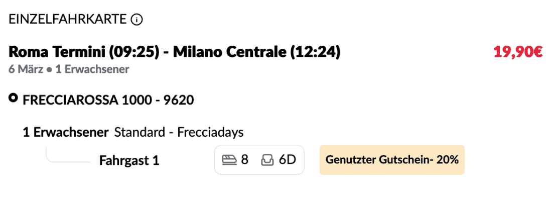 Um den Rabatt zu erhalten, sucht ihr einfach auf Trenitalia.com nach einer Zugverbindung und löst dann den folgenden Gutscheincode ein: