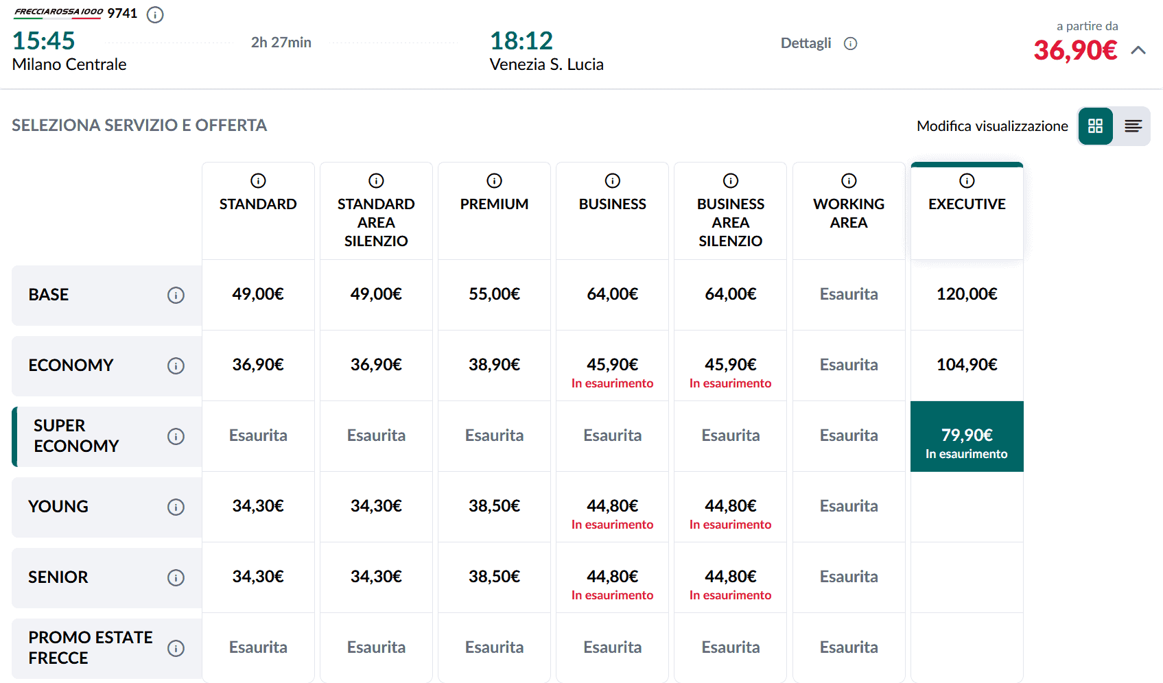 Der Tarif Super Economy gilt nicht nur in der Holzklasse, sondern ist für fast alle Reiseklassen verfügbar – einzig in der luxuriösen Executive Class konnten wir keine reduzierten Tarife mehr finden. Ihr müsst zudem einen Zug der Produktklassen Frecciarossa, Frecciargento oder Frecciabianca wählen. InterCitys, Regionalzüge und Nachtzüge sind ausgenommen.
