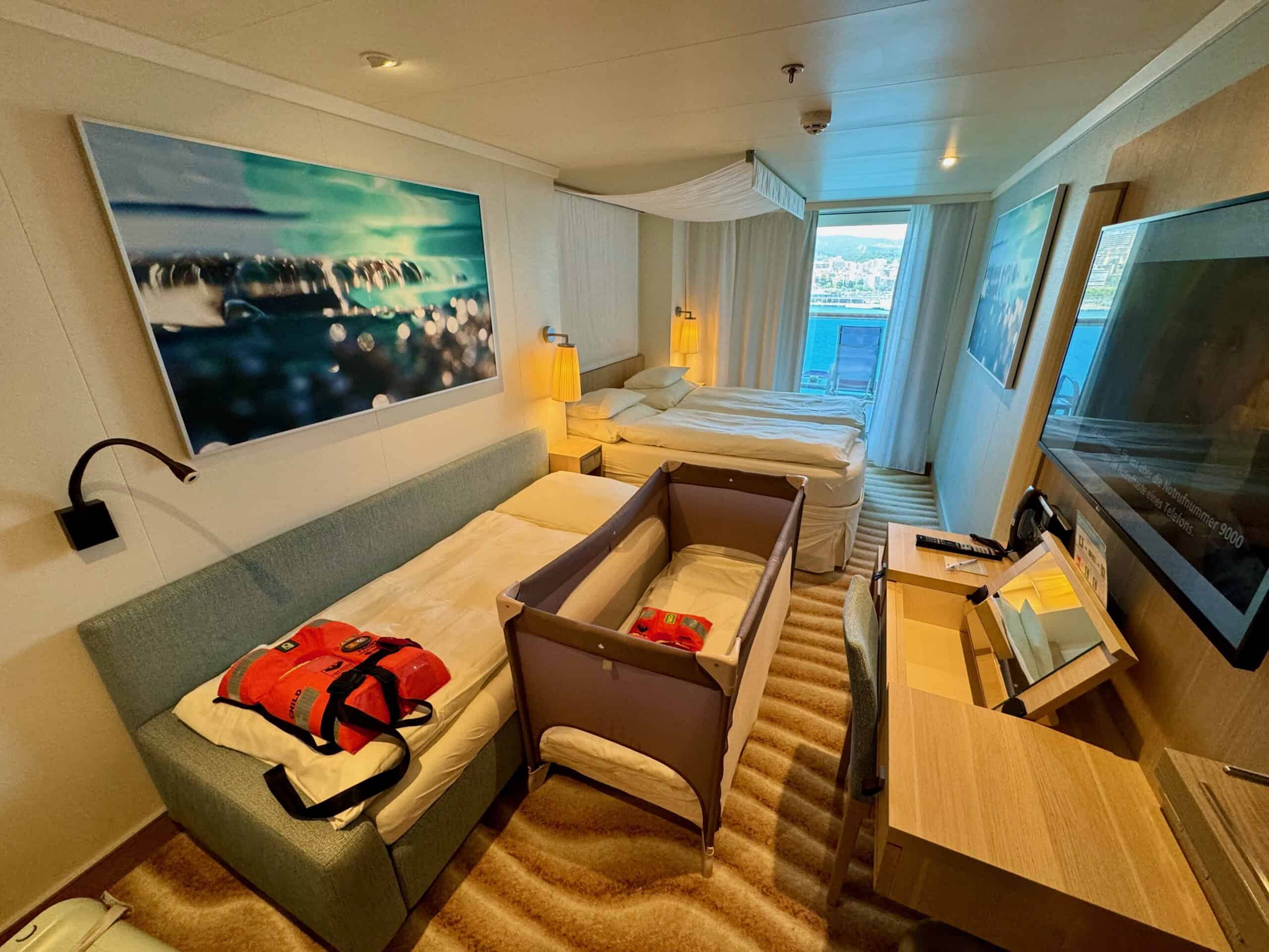 Bucht man eine Kabine mit einem Kleinkind, wird nur selten automatisch ein Babybett oder Rausfallschutz bereitgestellt. Meistens muss es extra bei der Reederei angefragt werden. Es steht an Bord auch nur eine begrenzte Anzahl an Babybetten bereit. Deswegen sollte dies am besten vor der Buchung geklärt werden.