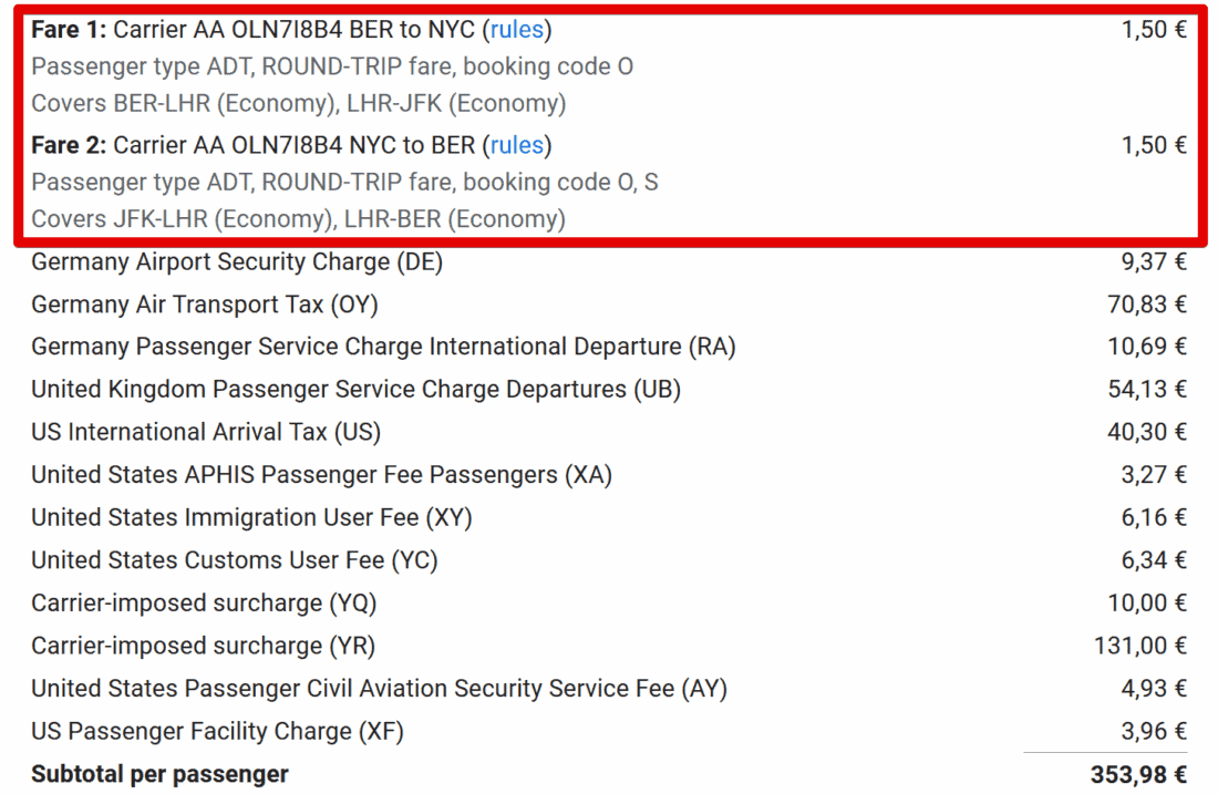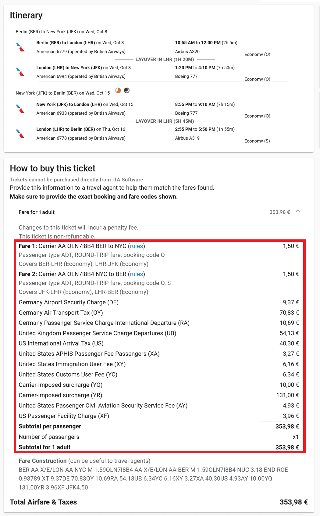Schon seit einiger Zeit gibt es von den Oneworld-Partnern British Airways, American und Co Flüge nach New York für rund 350€. In folgendem Fall haben wir die ITA Matrix benutzt, um den Preis aufschlüsseln zu lassen. Genau so wäre es aber auch über die Airline-Website und diverse Drittanbieter möglich: