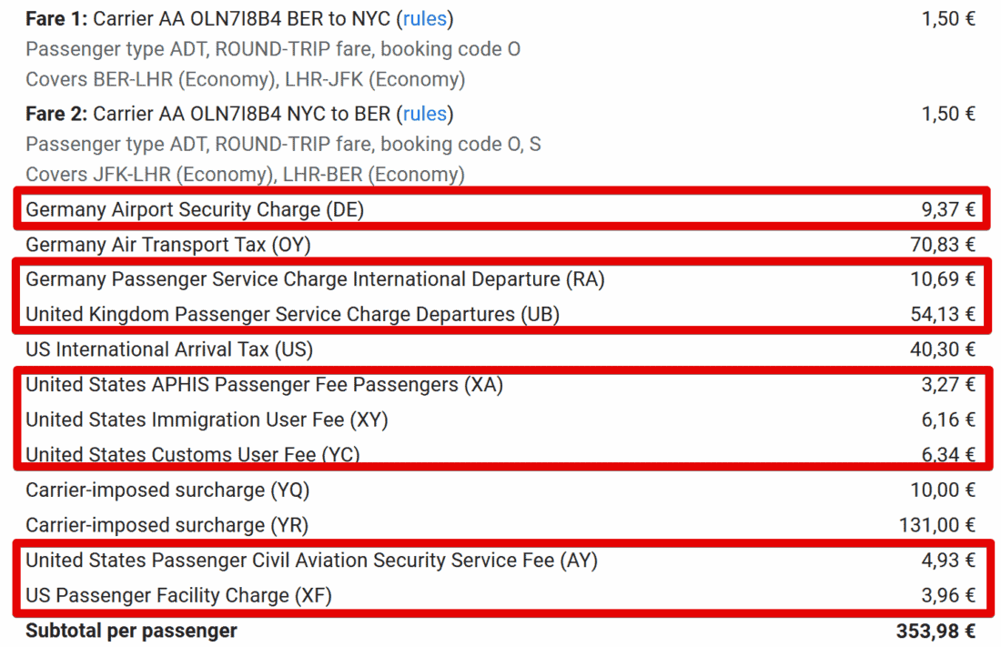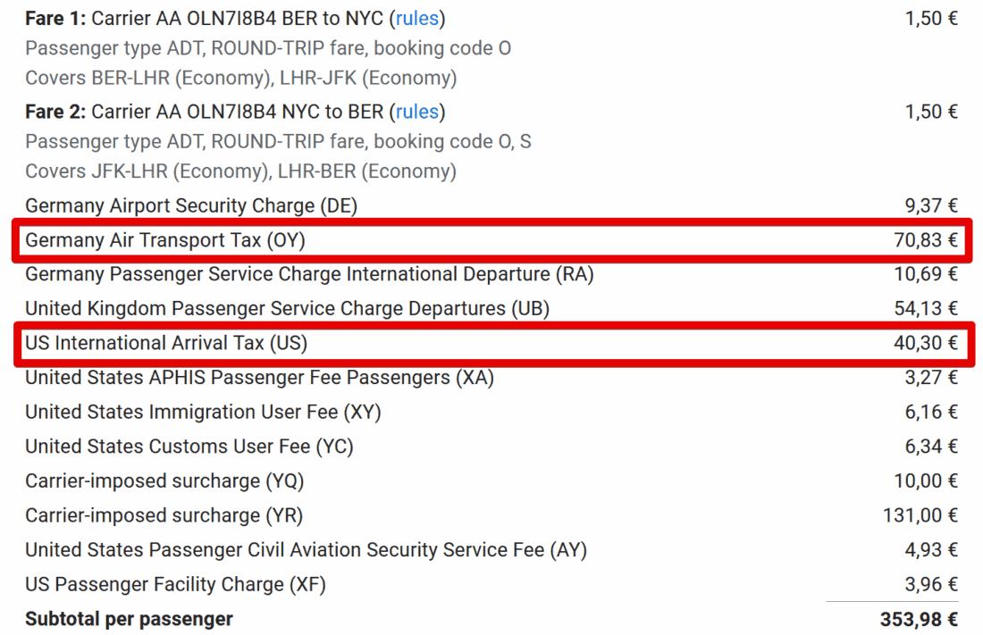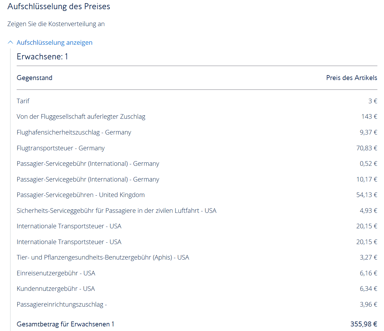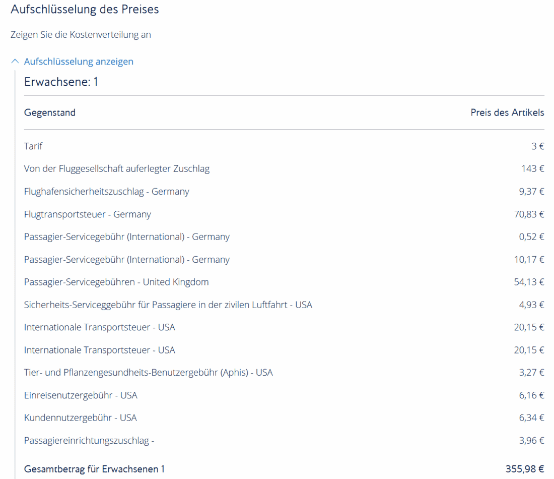 - US International Arrival Tax: Gebühr für Flüge, die aus anderen Ländern in den USA ankommen. Obwohl hier nur als Arrival Tax ausgewiesen, enthält der Posten auch die amerikanische Steuer für internationale Abflüge in gleicher Höhe. Stand 2025 sind es somit 2x 22,90 US$