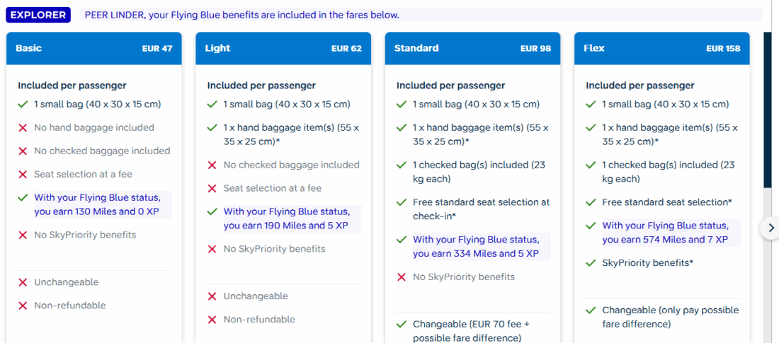 Statuskunden mit Flying Blue Silver, Gold, Platinum oder Ultimate Status erhalten auch im Basic-Tarif ein kostenfreies Handgepäck und mindestens ein Freigepäck. Ob es ein großes Handgepäck auch für fremde SkyTeam-Vielflieger gibt, ist noch unklar. Ein Stück Aufgabegepäck sollte es aber auch dort geben.