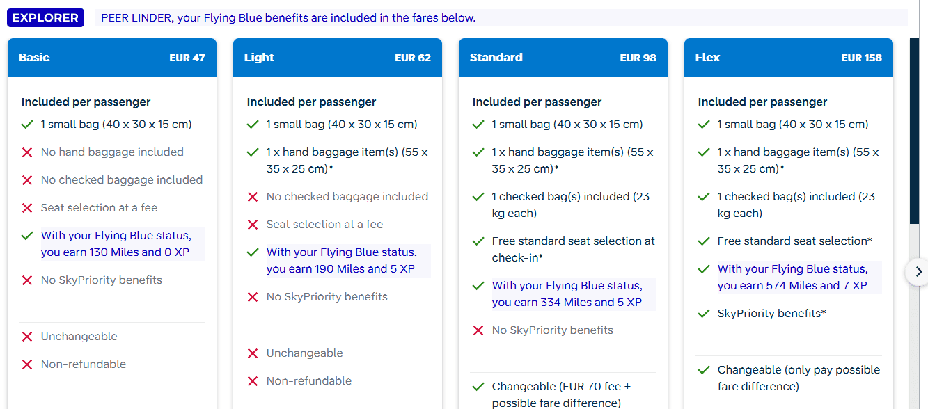 • reguläre Prämienmeilen bei Flying Blue (4 Meilen bis 9 Meilen pro Euro)