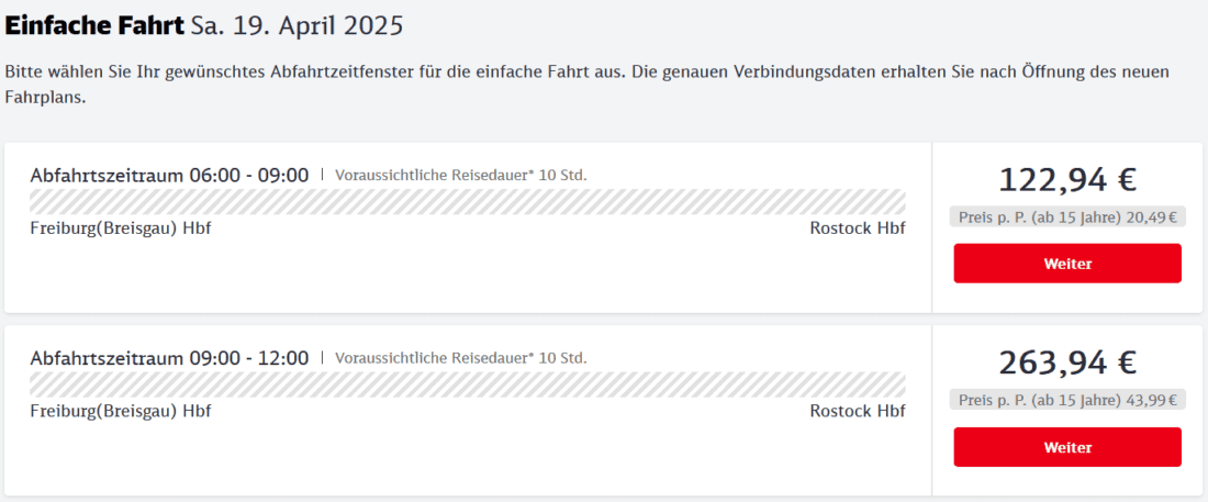 Buchbar ist das Ganze ab mindestens 6 Reisenden (> 6 Jahre) in einer Buchung. Dafür sind die Preise teilweise recht attraktiv. Man könnte beispielsweise am Samstag vor Ostern für 20,49€ einmal quer durch Deutschland fahren (von Freiburg nach Rostock). Zudem sind Sitzplatzreservierung und Storno-Option enthalten: