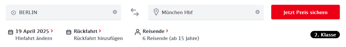 Dort müssen dann zunächst Verbindung und Anzahl der Reisenden eingegeben werden. Bislang steht das Angebot ausschließlich für innerdeutsche Verbindungen in der 2. Klasse zur Verfügung.