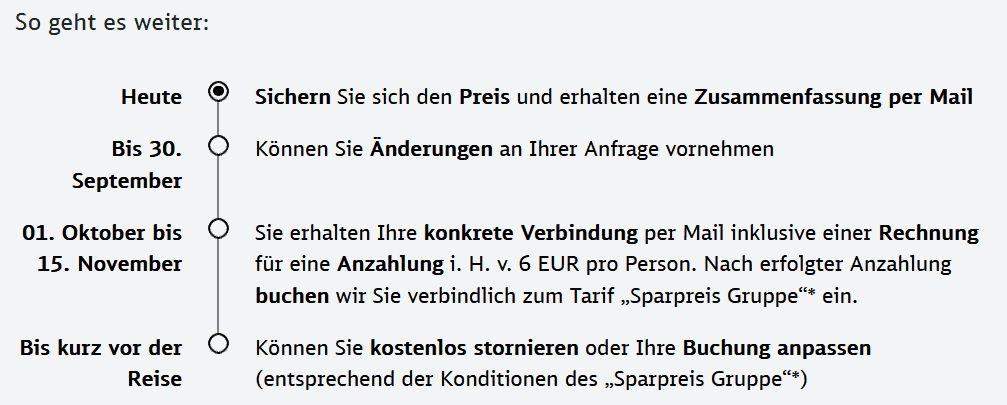 Wie es dann weitergeht, wird im nächsten Schritt erklärt. Die konkrete Verbindung wird im Oktober oder November zugeschickt. Dann muss auch die Anzahlung i.H.v. 6€ pro Person geleistet werden. Dann bucht ein Mitarbeiter der DB offenbar per Hand die Verbindung ein, denn es gelten die Tarifbedingungen für personalbediente Verkaufsstellen.