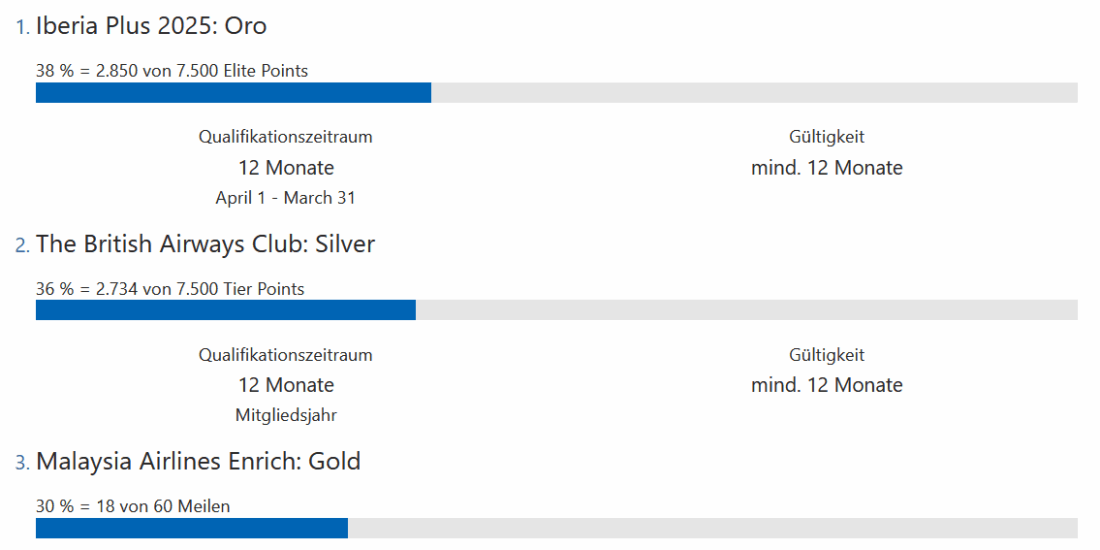 - Für Flüge mit Iberia & American gibt es umsatzbasierte Tier Points, aber keine Bonuspunkte