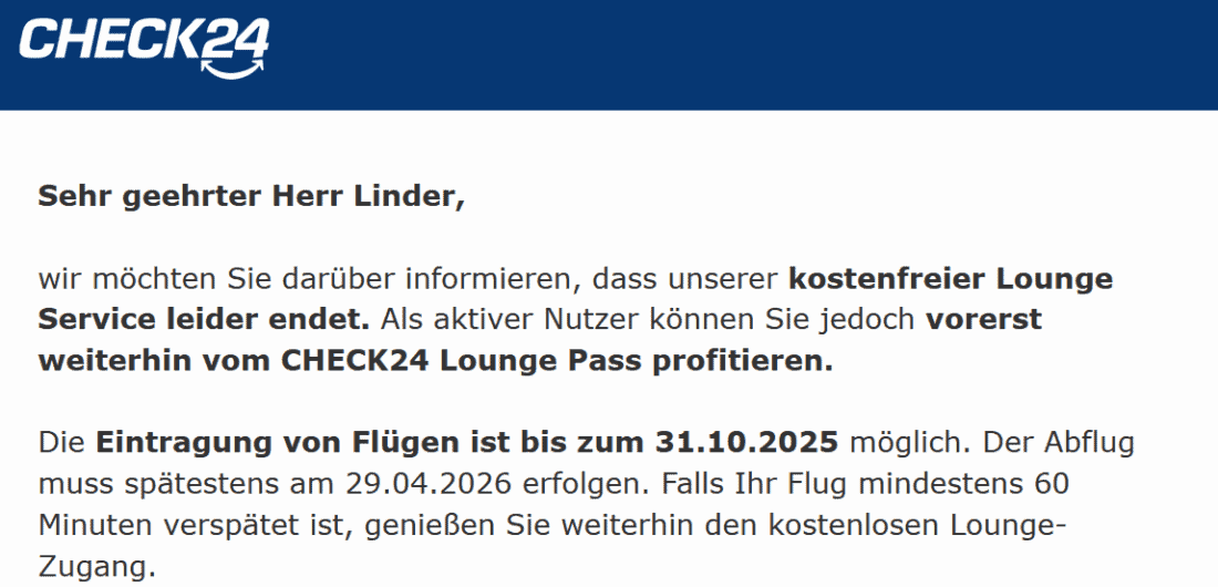 Nun nimmt man auch noch das letzte Stück der Salami, denn Anfang 2026 wird der Lounge Pass auch für Bestandskunden eingestellt. Das teilte Check24 betroffenen Kunden per E-Mail mit:
