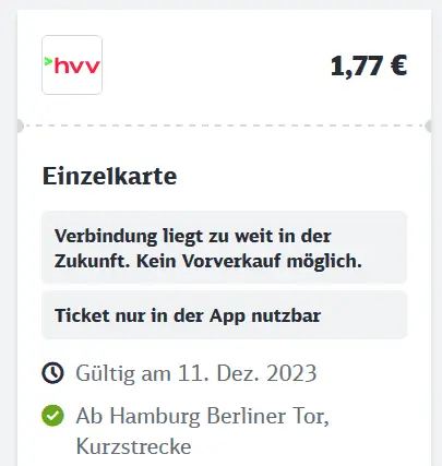Die Bahn verlangt allerdings 6,20€ Aufpreis, da direkt das City-Ticket gebucht wird. Das deckt zwar einen größeren Geltungsbereich (und weitere Verkehrsmittel) ab als obige Einzelkarten, nur wäre das hier überhaupt nicht nötig.