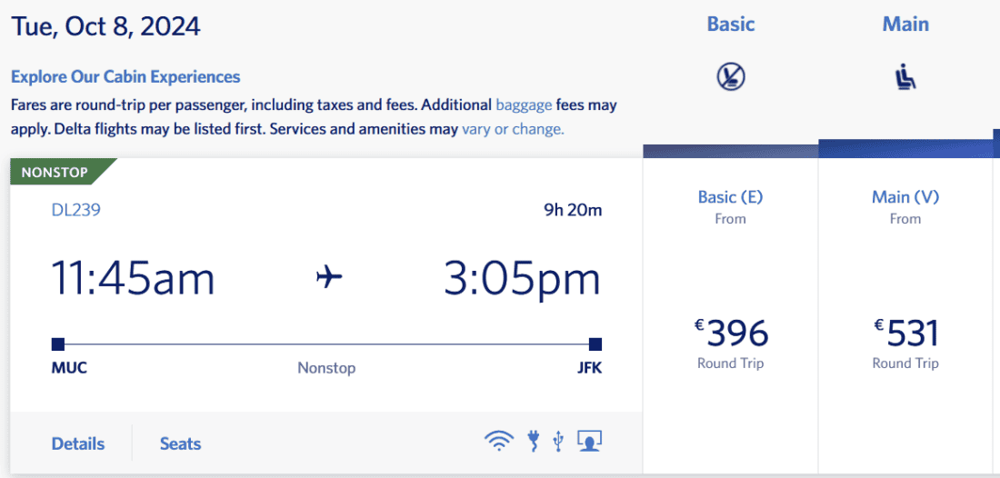 Dabei ist V in der Regel die Buchungsklasse, die bei einem Tarif-Upgrade von der Basic Economy in die Main Cabin Anwendung findet. Beispiel: Delta verkauft derzeit Hin- und Rückflüge von München nach New York für 396€ (Basic Economy) bzw. 531€ (Main Cabin), wie in folgendem Screenshot zu sehen: