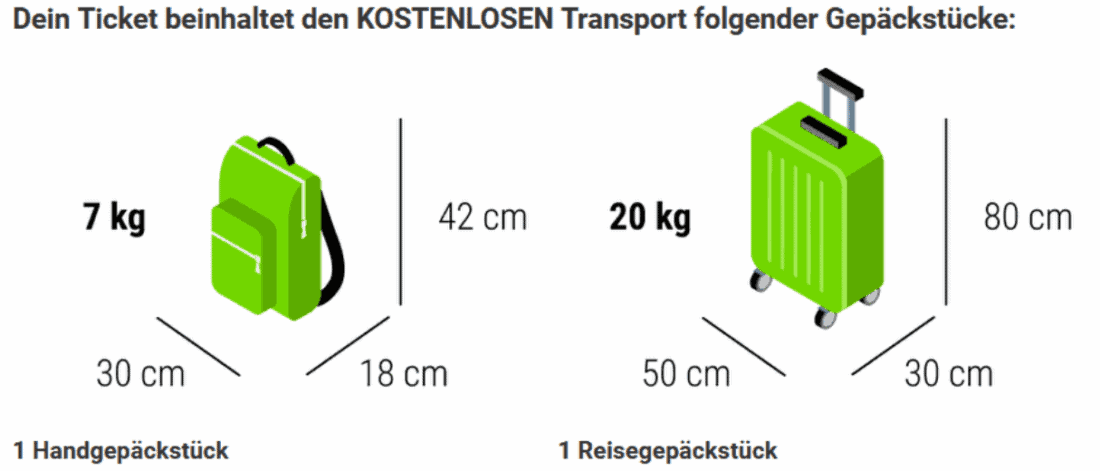 Die Mitnahme von weiterem Gepäck ist begrenzt auf ein weiteres kostenpflichtiges Gepäckstück pro Fahrgast mit einer maximalen Größe von 50 x 30 x 80 cm und einem Maximalgewicht von 20 kg. Die Gepäckgebühr variiert je nach Strecke, Linie und Zeitpunkt der Buchung.