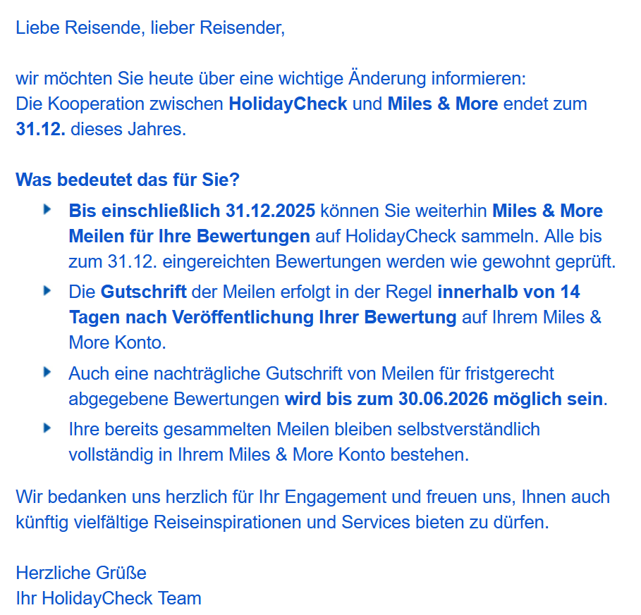 Leider wird diese Art des Meilensammelns künftig nicht mehr möglich sein. Holidaycheck hat ihre Mitglieder heute darüber informiert, dass die Kooperation mit Miles&More zum Jahresende ausläuft. Ab 1. Januar ist es demnach nicht mehr möglich, Meilen für neue Bewertungen zu erhalten. Einzig eine nachträgliche Meilengutschrift (für Bewertungen bis 31. Dezember) wird noch 6 Monate länger möglich sein.