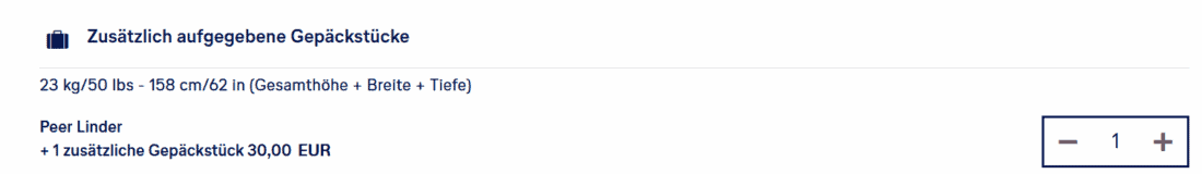 Wer hingegen zunächst den Light-Tarif wählt, kann im weiteren Buchungsverlauf einen Koffer für „nur“ 30€ pro Richtung dazu buchen. Braucht man nur das Freigepäck, spart man auf diesem Wege 2x 20€: