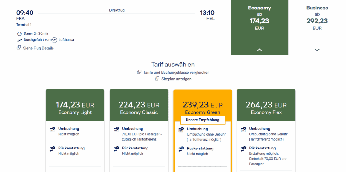 Mit der neuen Preisstruktur sollte man genauer hinschauen. Dafür bleiben wir beim Beispiel Frankfurt – Helsinki. Wie oben zu sehen, kostet das Upgrade von Light in den Classic-Tarif dort stolze 50€ pro Strecke.