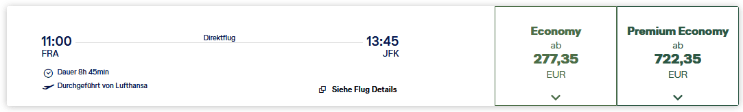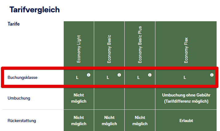 . Dieser öffnet dann folgende Ansicht, der die Buchungsklasse entnommen werden kann: