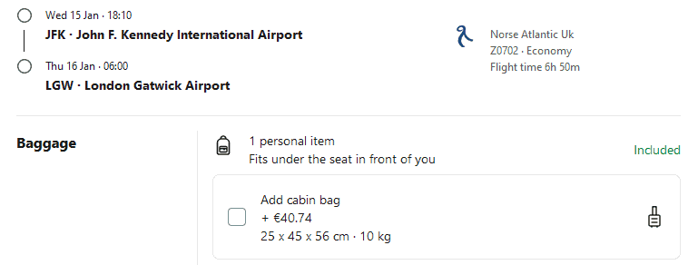 Seit Sommer 2022 bietet der Billigflieger Norse Atlantic Flüge über den Atlantik an. Dabei weist das Geschäftsmodell zahlreiche Parallelen zum früheren Langstreckengeschäft von Norwegian Airlines auf. Das betrifft auch die Tarifstruktur. In den günstigsten Economy-Tickets war kein großes Handgepäck inkludiert, sondern nur ein Personal Item. Und die Größe dessen wurde mittlerweile auch noch von 45 x 36 x 22 auf lächerliche 40 x 30 x 15 cm reduziert, damit auch ja jeder für einen Kabinentrolley zahlen muss.