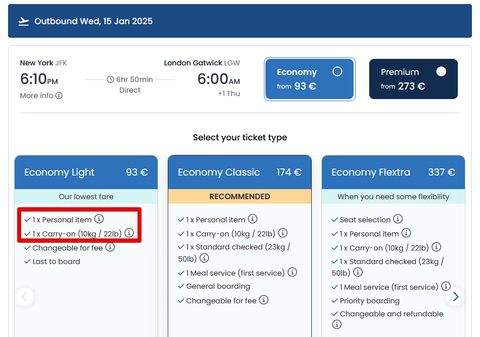 To show our gratitude to our loyal customers and adventurous explorers, we’re excited to introduce some fantastic updates to our Economy fare bundles. For new bookings made from September 2nd onwards, our Economy Light fares will now include a complimentary carry-on bag of up to 10kgs/22lbs, in addition to an underseat personal item.
