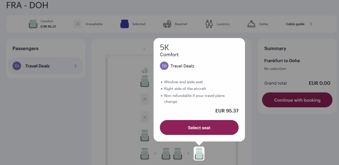 Tatsächlich werden im nächsten Schritt dann aber Gebühren fällig, sobald man einen Platz auswählt. Am Beispiel von Frankfurt – Doha kostet jeder Sitzplatz 95,37€: