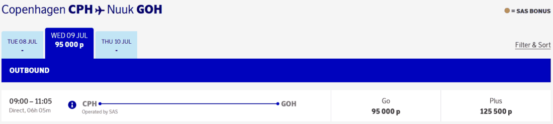 Besonders interessant könnte die neue Verbindung für alle Meilensammler werden. Gestern war die neue Verbindung Kopenhagen → Nuuk an zahlreichen Terminen für nur 15.000 EuroBonus-Punkte und knapp 30€ Steuern buchbar. Denn Grönland wird von EuroBonus zur Zone Europa zugeordnet und ist entsprechend günstig buchbar.