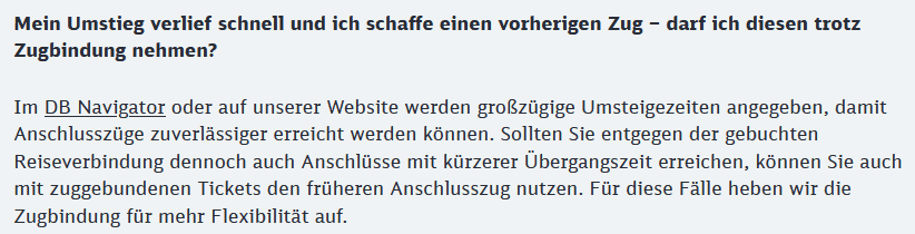 Damals versicherte die Bahn aber, dass niemand ein Problem bekommen soll, wenn er einen früheren Anschlusszug erwischt als geplant. Bis November 2024 fand sich somit auch folgender Abschnitt in den Bedingungen zur Zugbindung:
