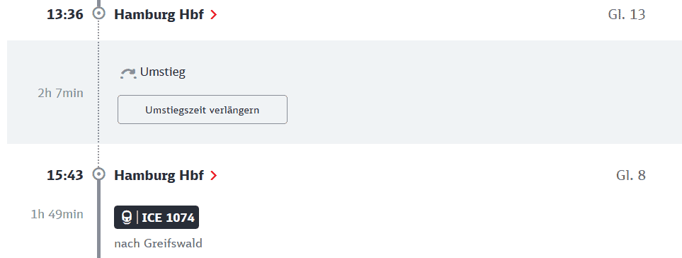 - 2 Stunden und 7min am Hauptbahnhof Hamburg warten, bis der nächste ICE fährt (am günstigsten)