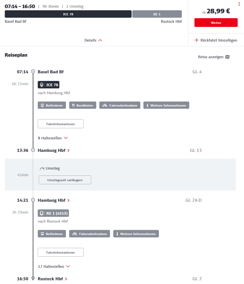 Auf das Thema bin ich nicht zufällig gestoßen, sondern auf der Suche nach einer Bahn-Verbindung von Basel nach Rostock. Die DB schlägt dazu nur eine Verbindung mit Umstieg auf den Regional-Express vor. Macht insgesamt knapp 10 Stunden Fahrtzeit: