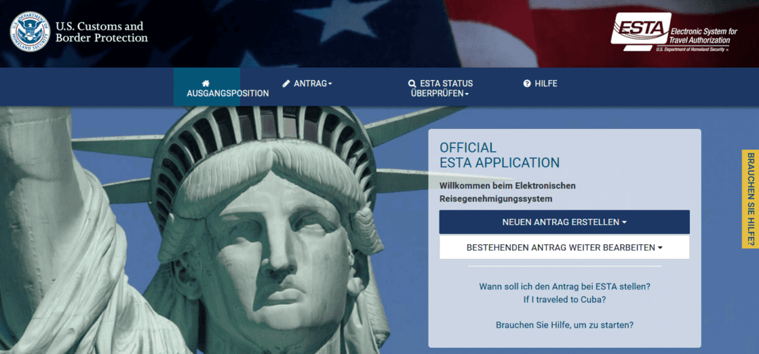 Es gibt nur eine offizielle Website zum ESTA-Abschluss. Die lautet esta.cbp.dhs.gov und sieht (Stand August 2023) wie folgt aus: