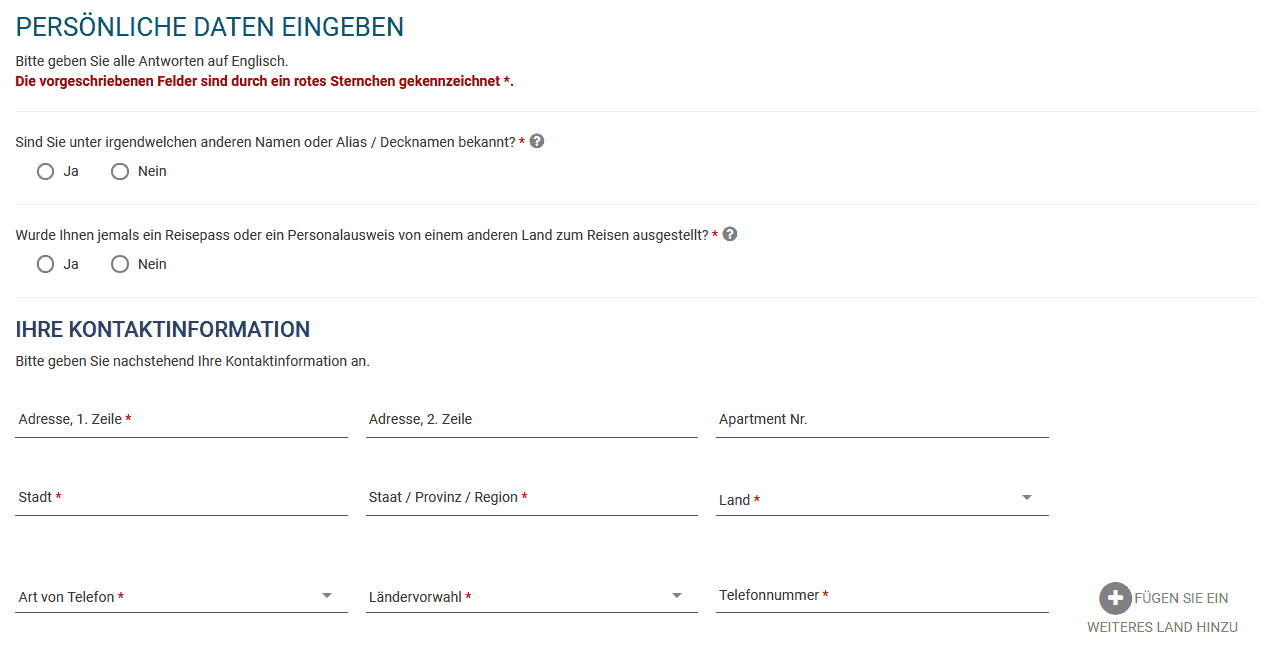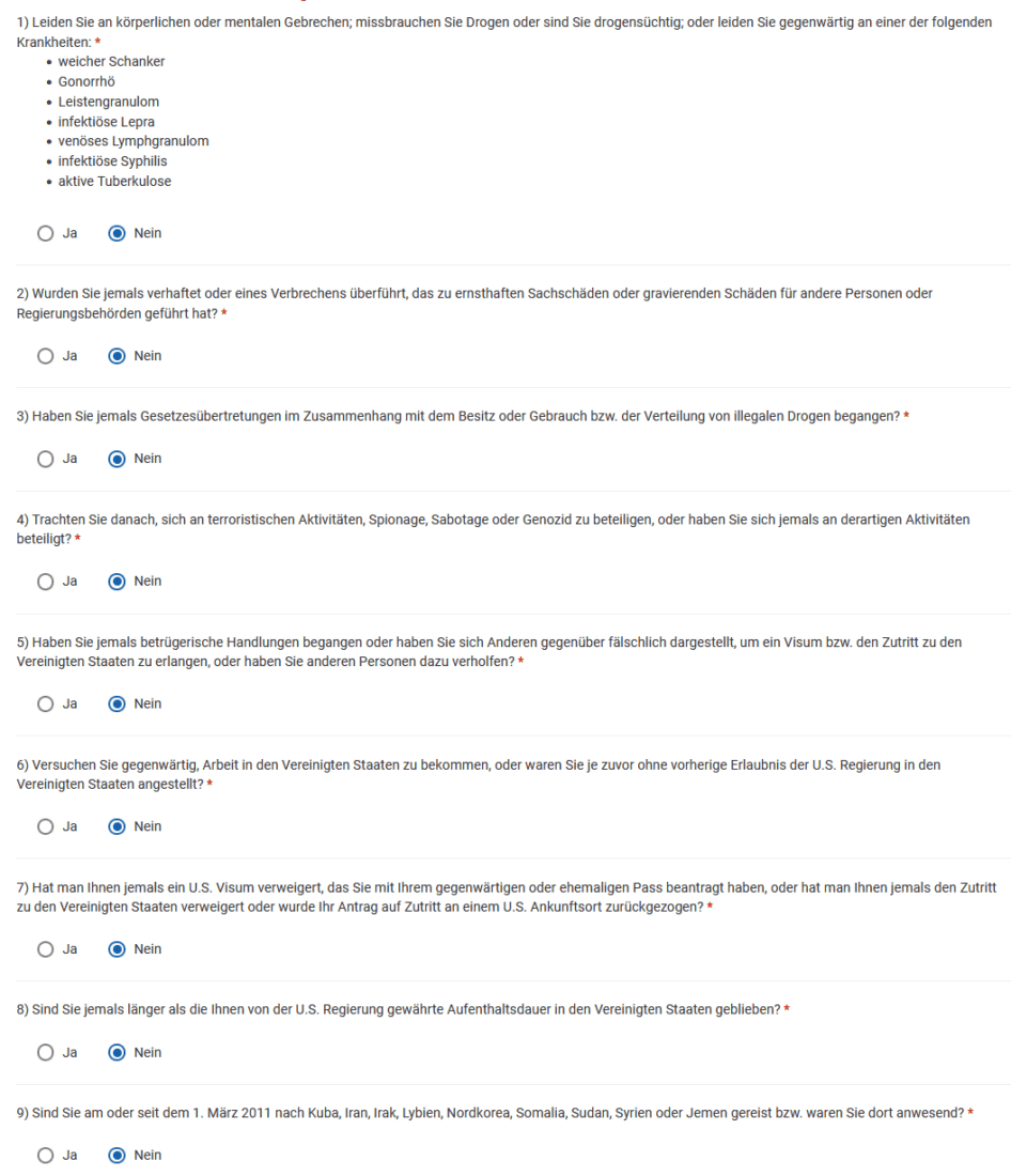 Fast geschafft. Zum Abschluss müsst ihr noch einige Fragen beantworten. Dort geht es bspw. um infektiöse Krankheiten, vergangene Probleme mit Visa & Einreise sowie den Besuch bestimmter Staaten wie Kuba oder dem Iran.