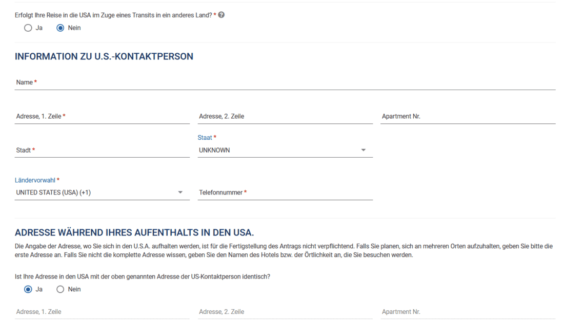 Beim Antrag ist zwingend eine Kontaktperson in den USA sein. Meistens wird dies wohl das gebuchte Hotel sein. Wer noch kein Hotel gebucht hat, kann ansonsten auch ein beliebiges Hotel bzw. UNKNOWN angeben und dies später wieder ändern.