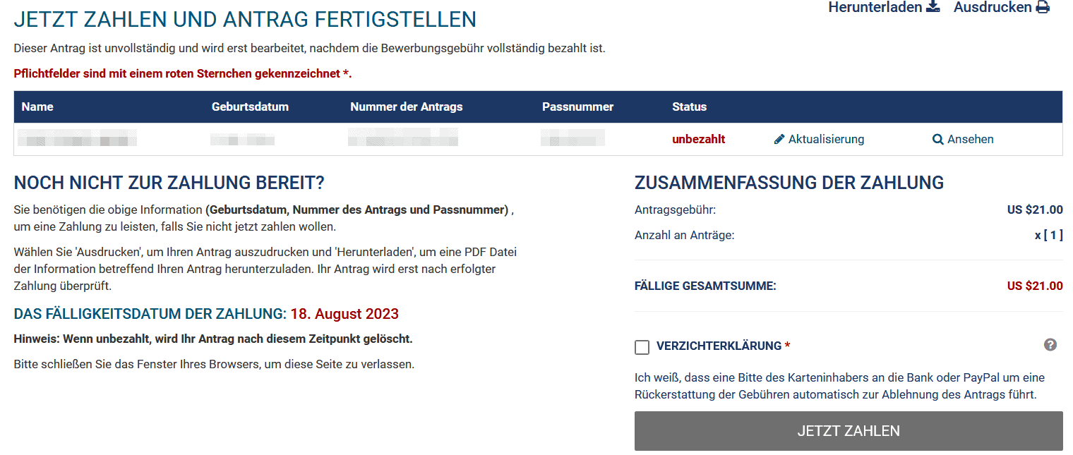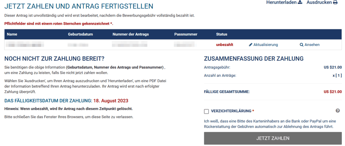 Im letzten Schritt geht es dann an die Bezahlung der Antragsgebühr i.H.v. aktuell 40 $ (~34 €). Zahlen könnt ihr wahlweise per PayPal (= Lastschrift möglich) oder mit einer Debit- bzw. Kreditkarte.